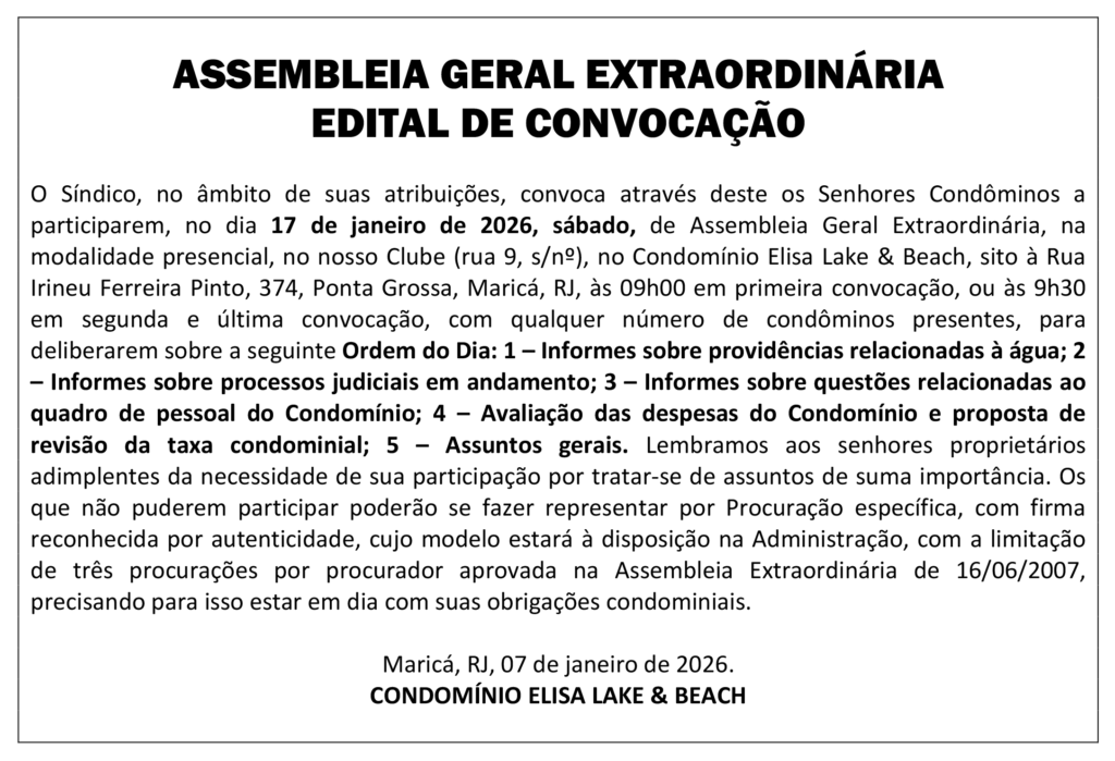 Assembleia dia 17 de janeiro de 2026. Veja o Edital