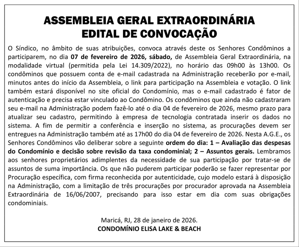Assembleia dia 7/2/26 decide taxa condominial