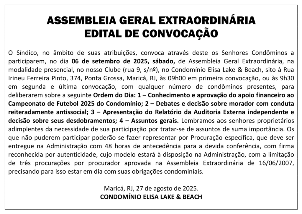 O relatório da Auditoria Externa Independente será apresentado aos condôminos em Assembleia Geral Extraordinária (A.G.E.) convocada para o sábado 6 de setembro, a partir das 9 horas, no Clube do Condomínio. Veja o Edital de Convocação abaixo.